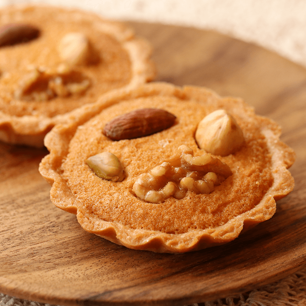 タルト生地は、発酵バターの豊かなコクと軽やかな食感が両立するように、研究に研究を重ねた独自の練り方で作り上げました。香ばしいタルト生地にコクのあるアーモンドクリームを流し込み、ピスタチオ、アーモンド、ヘーゼルナッツ、クルミをのせています。